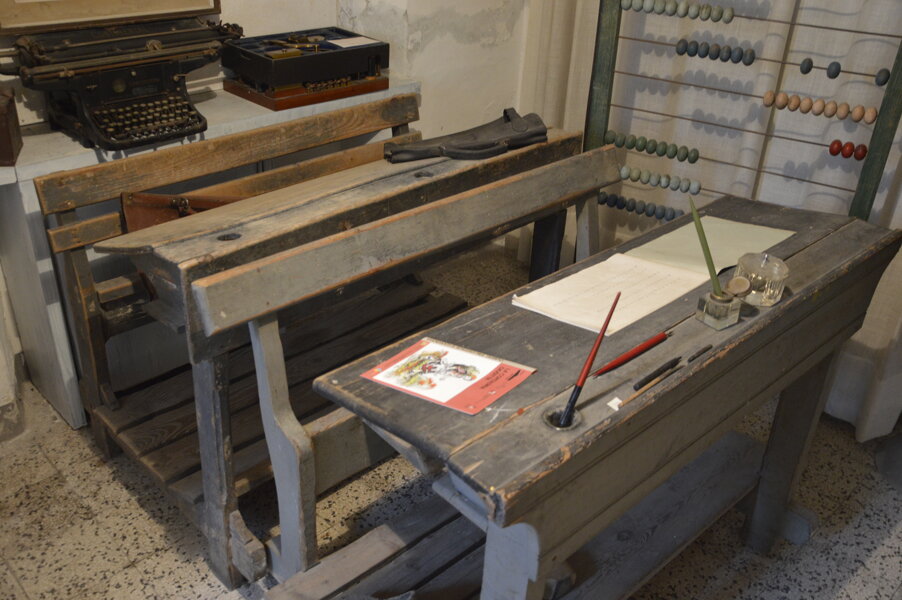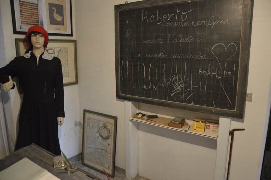 La sezione dell’ambiente scolastico, attraverso la presenza di arredi tutti originali, ricostruisce fedelmente la tipica aula scolastica della prima metà del 900. Al muro è appesa la lavagna sulla quale la maestra scriveva con il gesso, di fronte trovano spazio i banchi in legno sui quali si possono osservare alcuni materiali scolastici, come i pennini che dovevano essere intinti nei calamai per poter essere usati. I calamai erano delle piccole ciotole che contenevano l’inchiostro, inseriti in fori creati apposta sui banchi. Il materiale scolastico era molto semplice e molto poco costoso: un astuccio di pezza che aveva la forma di una busta chiusa con un bottone , all’interno della quale si trovavano un pennino, una matita, una gomma e, per chi poteva permetterselo (la maggior parte degli alunni erano figli di contadini poveri e non tutti riuscivano ad andare a scuola o comunque a restare per tutto il tempo necessario) anche un temperino e una piccola scatolina contenente dei pastelli. Si utilizzavano due quaderni di tipo diverso: uno a righe per gli esercizi di scrittura, i temi, i dettati e uno a quadretti per gli esercizi di matematica. Si studiava con due soli libri: il sillabario o abbecedario per imparare a leggere e a scrivere e il sussidiario che conteneva i rudimenti di matematica, storia, geografia. L’arredamento dell’aula scolastica si arricchisce con la presenza di un pallottoliere, di alcune cartine d’epoca e l’immancabile stufa in cotto che costituiva la fonte di riscaldamento durante l’inverno, alimentata dalla legna che spesso veniva fornita da ciascun alunno. Completa la sezione una raccolta di pagelle e una piccola biblioteca d’epoca oltre ad alcune fotografie che ritraggono varie scolaresche di un tempo.