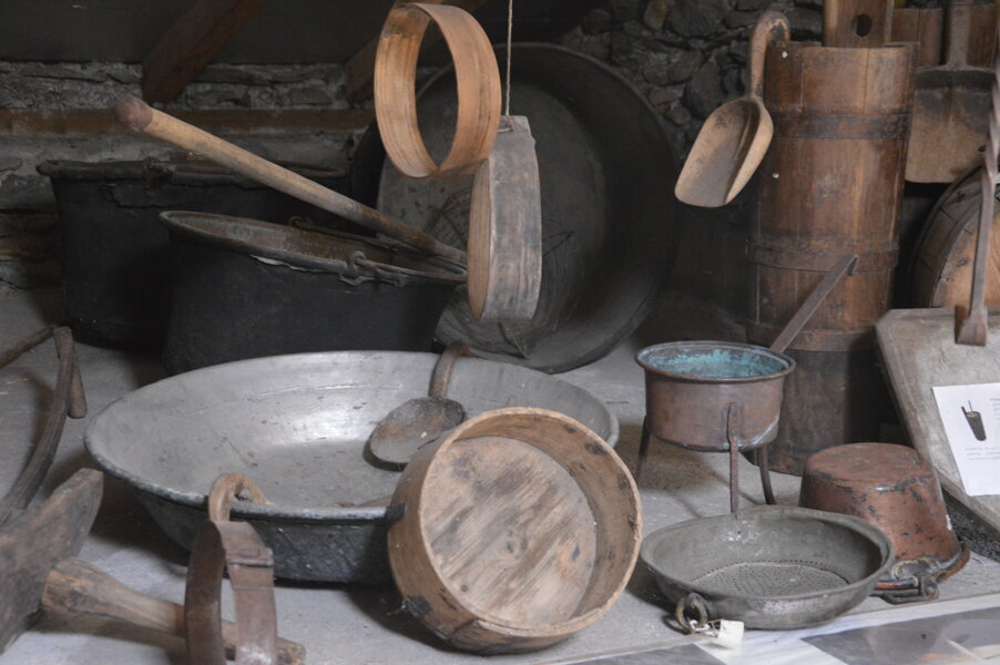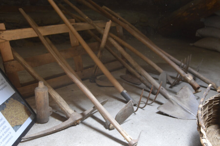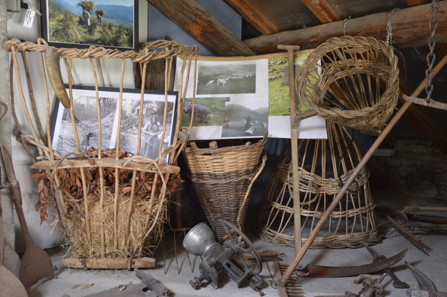 Nel passato sul territorio Colichese gli allevamenti costituivano una grande risorsa per gli abitanti ed erano concentrati soprattutto nelle frazioni dove risiedevano grossi allevatori che possedevano consistenti allevamenti soprattutto di bovini. Oltre a queste grandi aziende, nella prima metà del secolo scorso erano ancora numerosi i contadini che possedevano piccoli allevamenti che rappresentavano una fonte notevole di reddito. L’allevamento era strettamente legato al ciclo stagionale, ed avveniva nelle stalle durante il periodo invernale, all’aperto nella bella stagione, quando il bestiame era condotto a pascolare sui ‘monti’ e gli ‘alpeggi’. Durante la stabulazione, l’alimento principale per gli animali era rappresentato dal fieno che era stato riposto e compresso nel fienile sovrastante la stalla ed era tagliato con uno strumento a lama chiamato taiafè per essere gettato nella mangiatoia della stalla (preséf). Tre erano i tagli: il più abbondante (magèench), avveniva a maggio, il secondo a luglio (segund) e il terzo a settembre (terzöö). Se le annate erano favorevoli si tagliava anche il quartiröö. Falci, forche, rastrelli, gerli e campacc ma anche carri costituivano l’attrezzatura che ogni contadino utilizzava dal taglio dell’erba fresca fino al trasporto del fieno da riporre nel fienile. A primavera inoltrata si effettuava la transumanza a quote diverse per sfruttare il pascolo offerto dal territorio montuoso nei mesi estivi. Ecco che gli allevatori, spesso con l’intera famiglia , portavano il bestiame sui maggenghi a 700 - 800 metri. Esaurito il poco pascolo e il fieno riposto l’estate precedente, mandavano il bestiame all’Alpe fino alla fine di agosto affidandolo a un pastore. L’alpeggio estivo aveva un’importanza economica non indifferente sia per gli alpeggiatori che traevano guadagno dalla vendita dei prodotti, sia per la famiglia contadina che vedeva sfamare il proprio bestiame per diversi mesi senza intaccare la preziosa scorta di fieno e poteva dedicarsi ai faticosi lavori estivi dei prati e dei campi spesso coltivati a mais o altri cereali. Nella sezione espositiva, oltre ad attrezzi, trovano collocazione anche fotografie d’epoca che ritraggono contadini intenti nelle varie attività agricole e alcuni scatti delle transumanze.